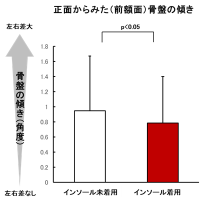 身体アライメントのゆがみは、筋肉の使い方などを改善することで整えることができますが、簡易的な方法として、物理的に補整できるインソールの効果を調査しました。114人に研究用のインソールを着用してもらい、10m歩行した際の骨盤や関節角度、関節モーメントなど49項目の変化を測定しました*6。その結果、インソール未着用時には骨盤角度が平均して0.95°左右いずれかに傾いていましたが、着用後には0.22°の傾きの改善が認められました(図3)。以上から、インソールを着用することで、身体アライメントのゆがみを補整できる可能性があると考えられます。