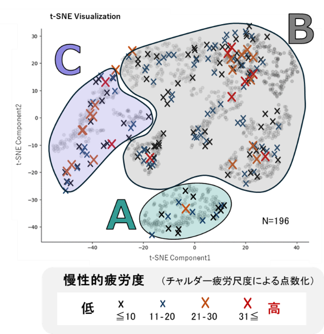 2024年に実施した歩行測定によって196名をA~Cタイプのいずれかに分類し、チャルダー疲労尺度で評価した慢性的疲労度のスコアと併せて図1に重ねてプロットしました*5(図2)。その結果、身体アライメントのゆがみが比較的良好なAタイプでは、疲労度の高い人はほとんど見られませんでしたが、対照的にCタイプでは疲労度の高い人が多く確認されました。以上のことから、身体アライメントのゆがみが慢性的疲労と密接に関連していることが示唆されます。