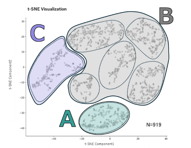 Walk Coordinator技術を搭載したアプリを使うと、わずか8歩の歩行から骨盤角度・関節角度・関節モーメントの左右差や可動性などを測定できます。このアプリを用いて、2023年に919人のデータを取得し*3、歩行時の身体アライメントの非対称性に関する52項目を機械学習で整理。身体アライメントのゆがみの程度で分類したマップを作成しました*4。このマップは、52項目から計算された一人ひとりの身体アライメントのゆがみ特徴に基づいてプロットしており、位置関係が近いほど特徴が似ていることを示しています(図1)。その結果、歩行に現れる身体アライメントの特徴は、類似度によって7つの小さなグループに分類でき、さらにそこから3つの大きなタイプに集約できることが判明。Cタイプは多くの項目でゆがみが認められた一方で、AタイプはCタイプに比べてゆがみが少なく、相対的に良好な身体アライメントを保持していると考えられました。また、AとCの中間にあたるのがBタイプとして示されました。