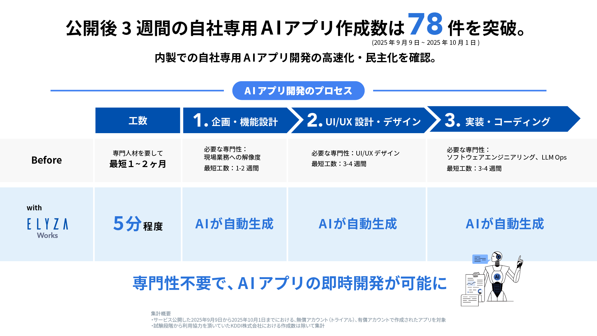[画像2: https://prcdn.freetls.fastly.net/release_image/47565/64/47565-64-057a0457cad4985c70bc33cf50c695cd-1920x1080.png?width=536&quality=85%2C75&format=jpeg&auto=webp&fit=bounds&bg-color=fff ]- 新規にトライアルを開始した企業含む利用社にて作成されたAIアプリ数は、サービス公開後の3週間(2025年9月9日~2025年10月1日)で78件を突破しました。