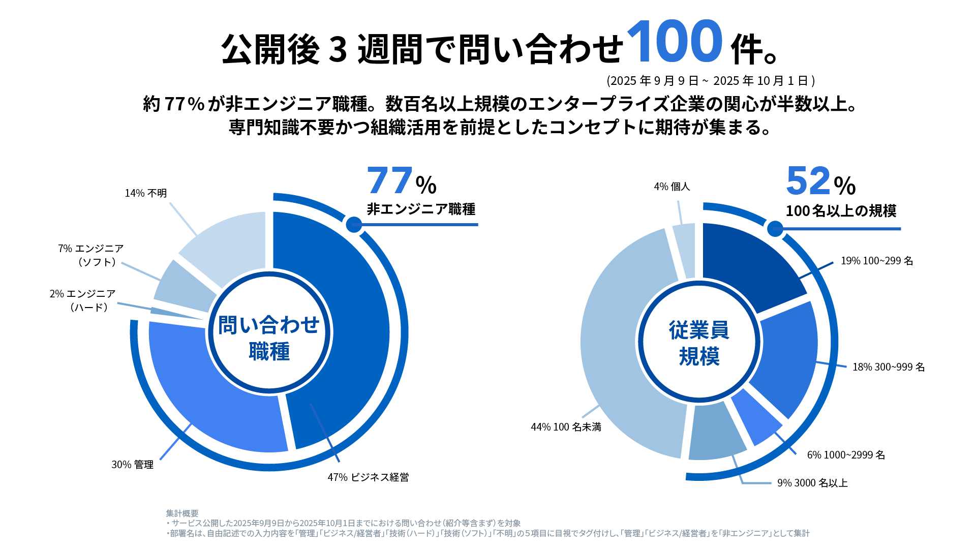 [画像3: https://prcdn.freetls.fastly.net/release_image/47565/64/47565-64-fbb0573f92ccde2cc3aeef19de98a210-1920x1080.png?width=536&quality=85%2C75&format=jpeg&auto=webp&fit=bounds&bg-color=fff ]- 現時点で広告出稿なしながら、公開後3週間時点で100件のお問い合わせをいただきました。 問い合わせ者の職種は、管理部門(経理財務や総務、コーポレート部門)が約30%、営業や企画などビジネス部門が約47%と、合計約77%が非エンジニア職種でした。