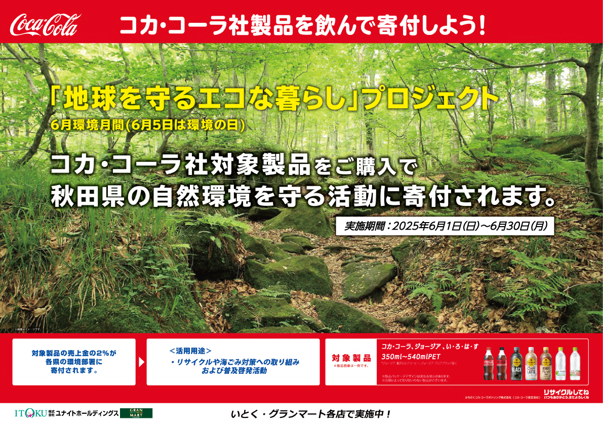 みちのくコカ・コーラボトリング、ユナイトホールディングスとの共同企画「地球を守るエコな暮らしプロジェクト」の売上の一部を秋田県へ寄付