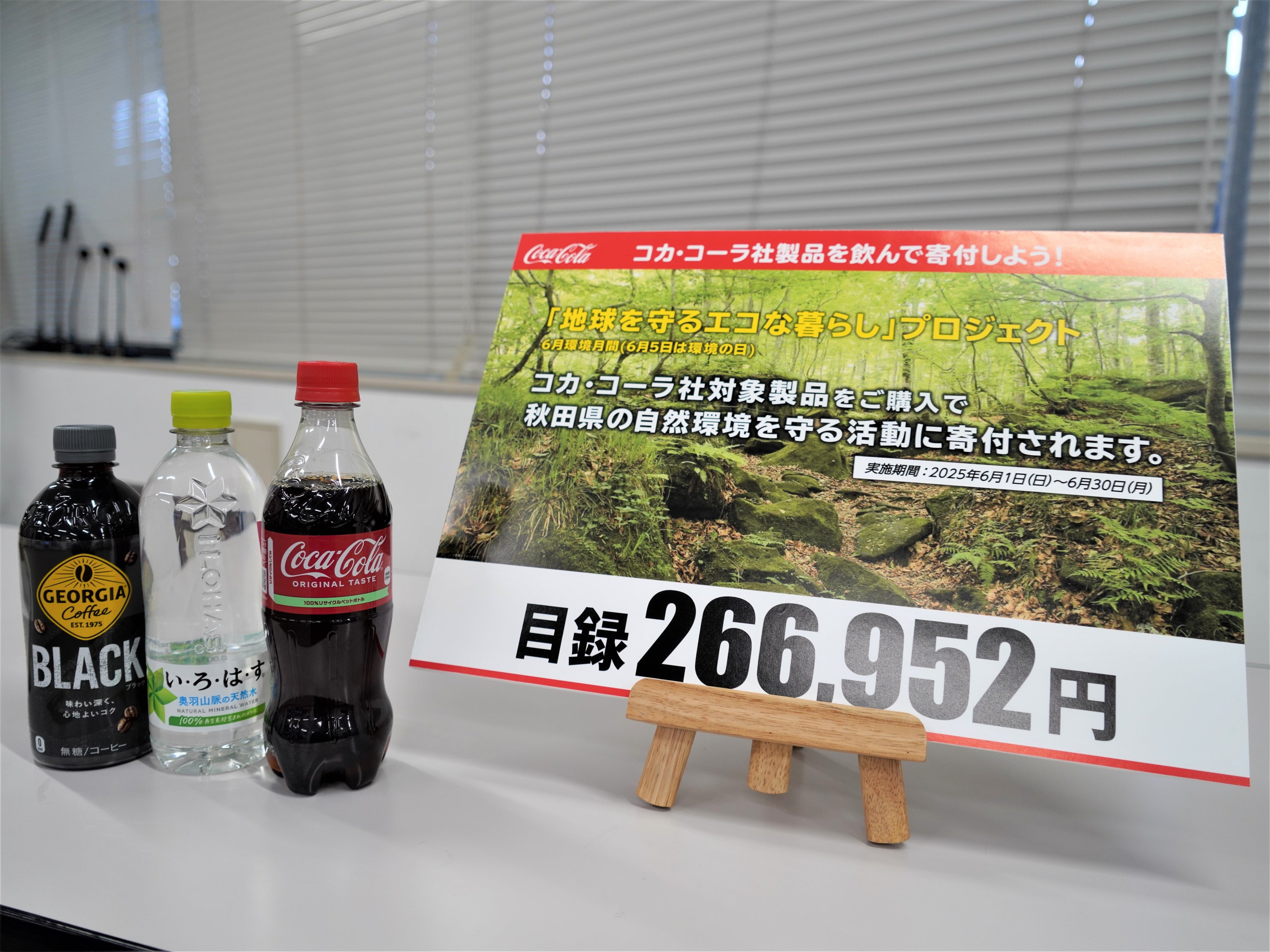 このプロジェクトは、6月の「環境月間」を県民へ周知し、環境の保全についての関心と理解を深め、積極的に環境保全活動を行う意欲を高めていただこうと、ユナイトホールディングス各店舗での店頭キャンペーンとして展開したものです。対象製品の売上の一部(1本につき2%)が秋田県へ寄付され、海岸漂着物地域対策推進事業に活用されます。期間中の売上本数は141,421本、寄付金額は266,952円となりました。