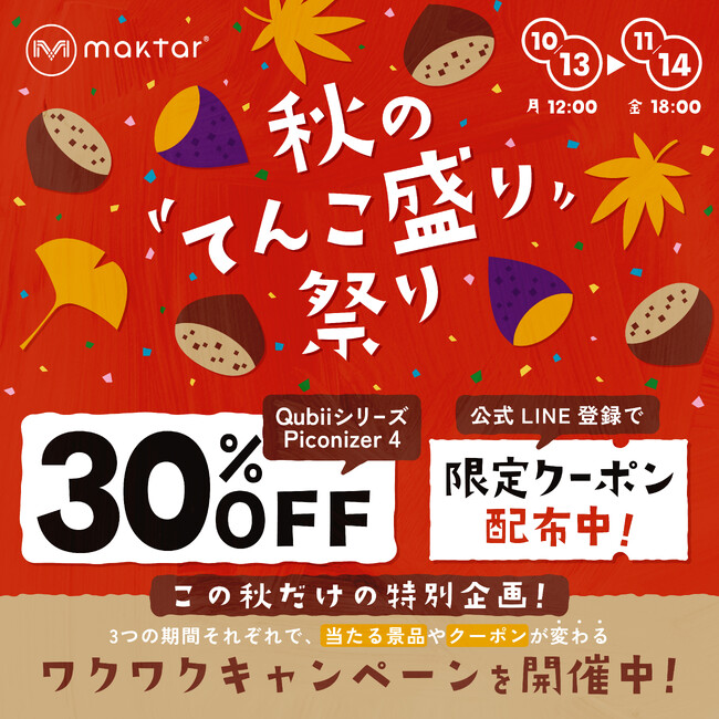 Maktar株式会社は、公式オンラインショップにて「Maktar 秋のてんこもり祭り-2025-」を開催中です。本フェアでは、Maktarの大人気スマホ・バックアップアイテム「Qubiiシリーズ」が最大35%OFF、「Piconizer 4」が15%OFFなど、お得に購入できるチャンスです。さらに、「食・エンタメ・超お得」をテーマにしたオススメ情報の紹介や購入者プレゼントなど、ワクワクするような企画をご用意しています。