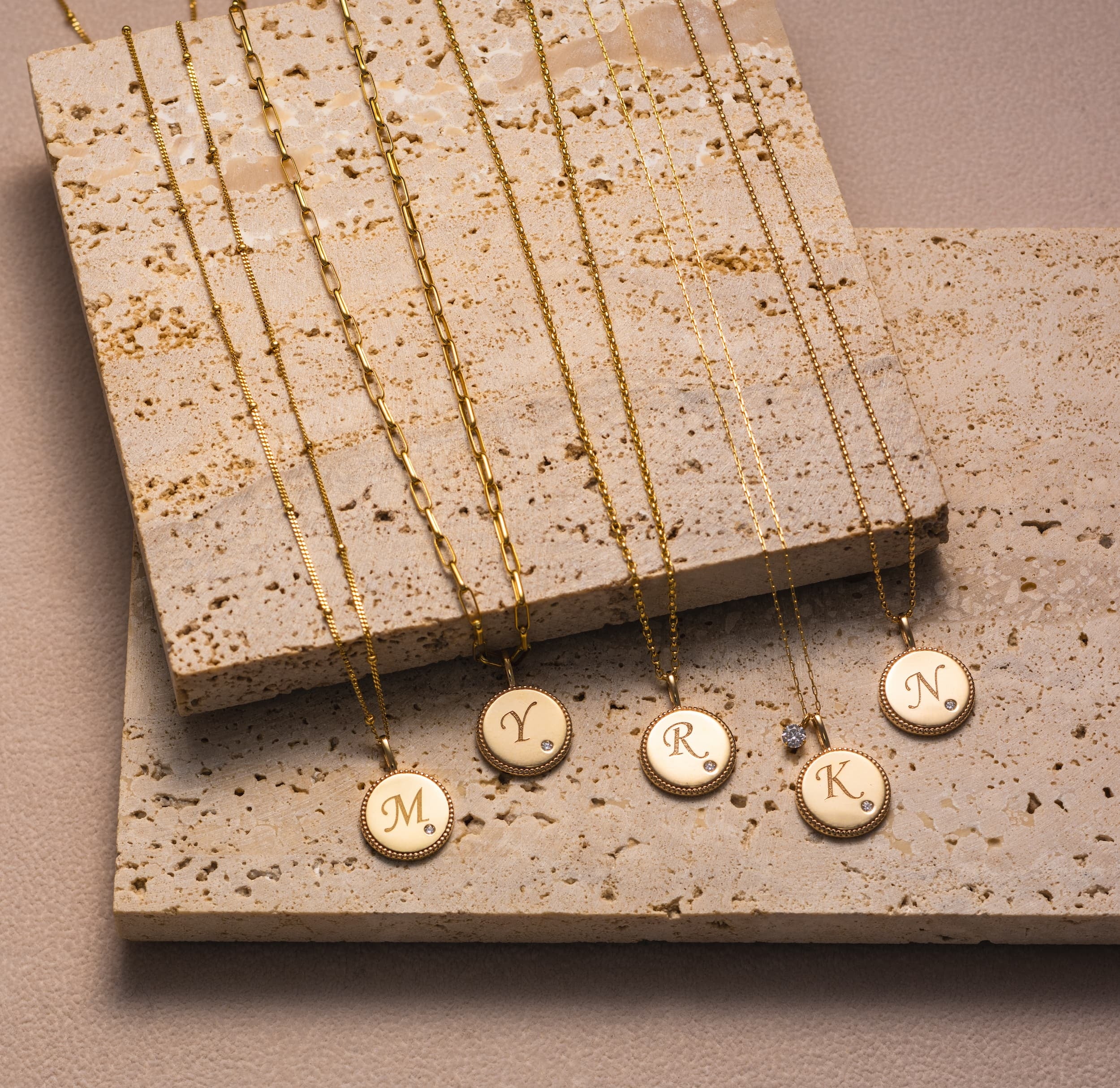 贅沢にゴールドを使った大人のためのコインジュエリー。大人の女性にふさわしい、上品で華やかなK18イニシャルコインペンダントネックレスが登場。