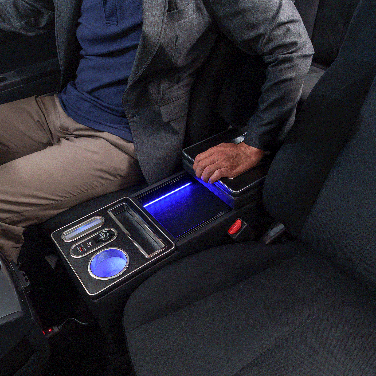 デリカ D5専用 LEDコンソールボックス。タイプA、タイプCシガーソケットを完備。夜も安心のLED搭載。大容量の収納ボックスは散らかりを一瞬で解決!