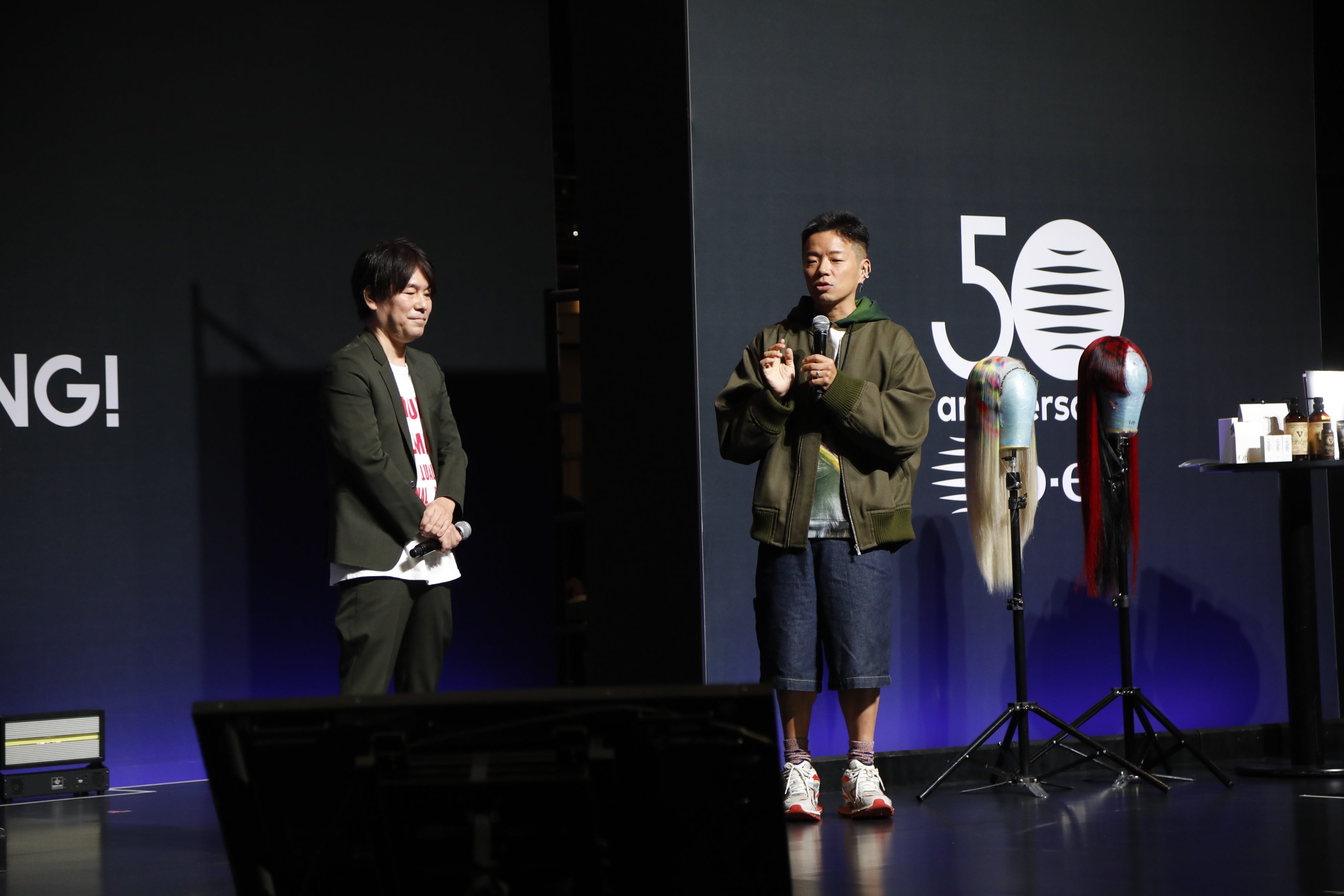 KIRATERA共同開発者のTHE SLICK 代表樗木さん、PELE 代表RYUSEIさんよりKIRATERAのブランド紹介がありました。RYUSEIさんは「100年使われるカラー剤をつくりたいという想いから始まり、トレンドに流されるのではなく、普遍性と柔軟性を兼ね備えたブランドを目指しています。」とブランドにかける想いを語りました。