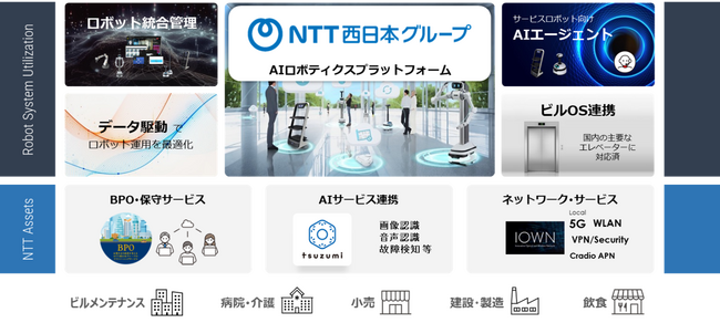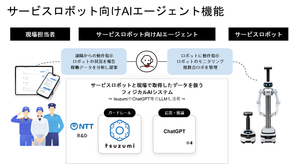 NTTが開発した日本語特化型大規模言語モデル「tsuzumi」※3をはじめとする複数の生成AIを活用し既存業務の改善・最適化を実現する機能など、さまざまな業種業態でロボットをより効果的に利用するための機能を提供いたします。