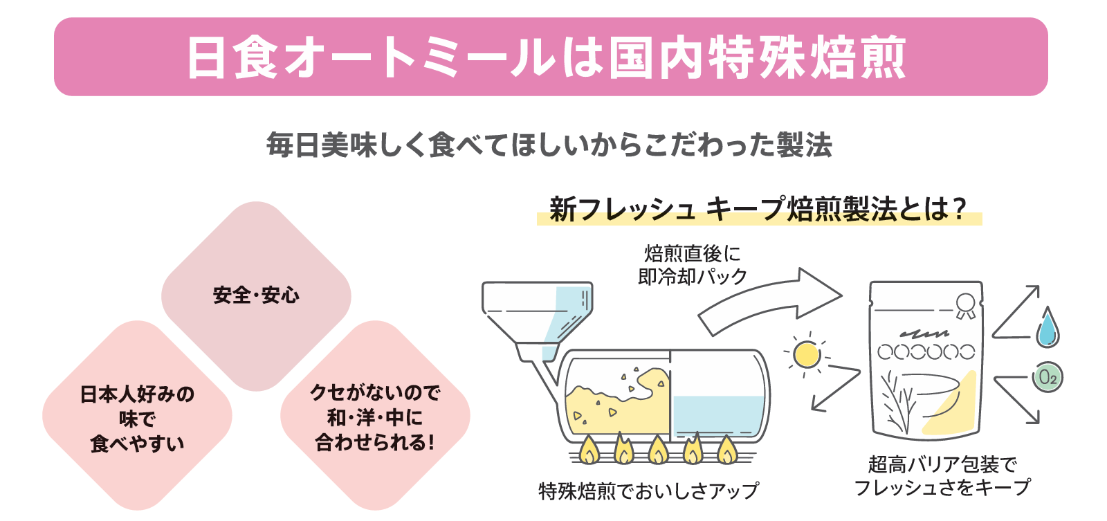 1. 「新フレッシュキープ焙煎製法」でおいしさ長持ち新開発の焙煎製法により、オートミール本来の 香ばしさと自然な甘みを引き出し、