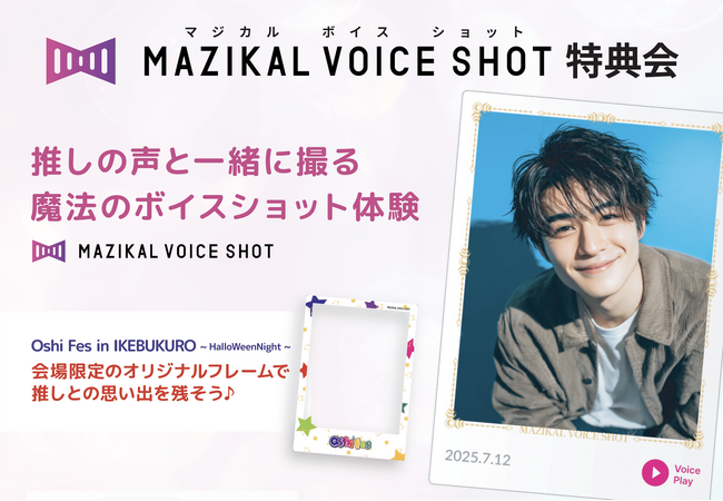 当日は、各出演アーティストの特別物販時間帯に合わせて『マジカルボイスショット』特典会を実施いたします。ファンの皆様は、推しのアーティストと撮影した写真に、その場で本人の"声"を収録することができます。会場限定のオリジナルフレームを使用し、推しとの思い出を"声とともに"残せる特別な体験をご提供します。