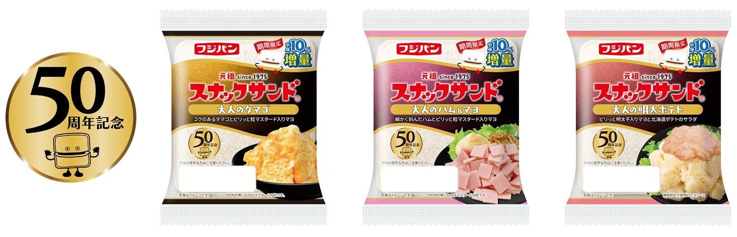 フジパン株式会社(愛知県名古屋市)の元祖携帯サンドイッチ「スナックサンド」が、2025年9月15日に発売50周年を迎えました。これを記念し、2025年11月1日(土)より、感謝の気持ちを込めた記念商品第2弾を期間限定で発売いたします。