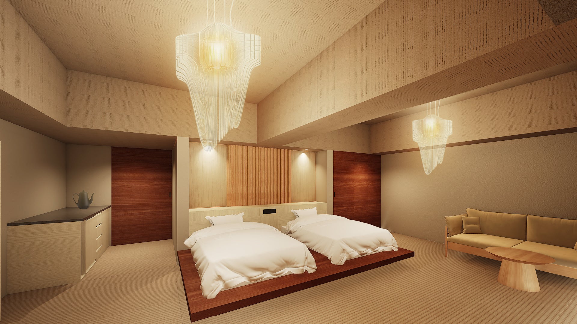 世界的に有名な建築家ザハ・ハディドが手がけた近未来型照明AVIA Pendant Lightを客室に。