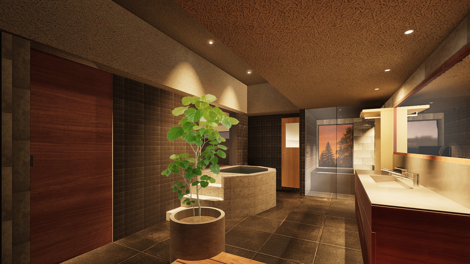 深さ80mの水風呂に目の前に広がる庭園。パウダールームは趣ある削り壁と石の素材感が調和し、間接照明が落ち着いた雰囲気を演出しています。