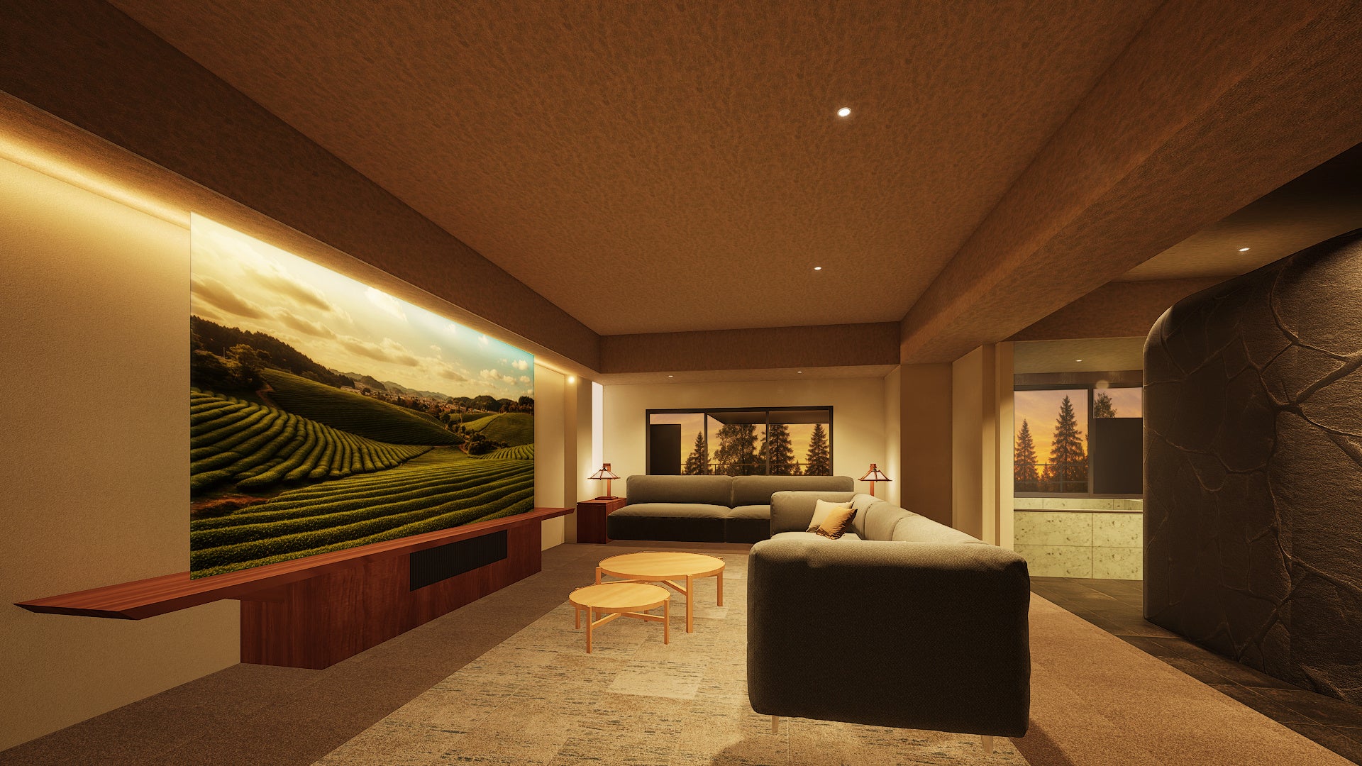 大型スクリーンに客室内プライベートサウナ。空間を贅沢に使った設計は、思わず声が漏れるほどの開放感をもたらします。