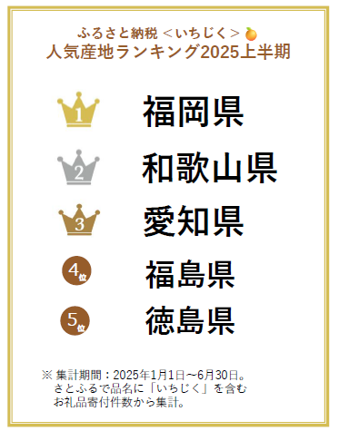 2025年上半期の「いちじく」の寄付件数を基にした人気産地ランキングでは、福岡県が1位となりました。同県では、5月のハウス栽培から11月の露地栽培まで長期出荷が可能で、オリジナルブランド「とよみつひめ」は、上品な甘さととろけるような果肉が特徴です。市場にあまり出回らない希少品種ですが、いちじくを初めて食べる方にも食べやすいと好評です。
