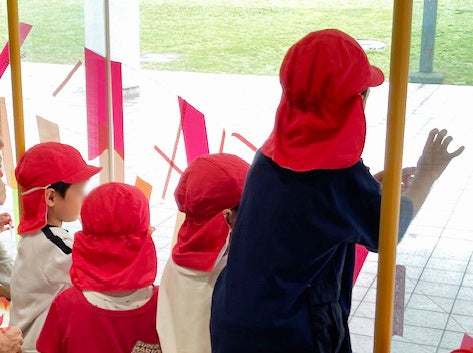 また、今回の「キッズコーナー」リニューアルオープンを記念して、地元の保育園や幼稚園の園児たちと一緒に、マスキングテープなどを使って窓を明るく楽しいデザインに装飾しました。