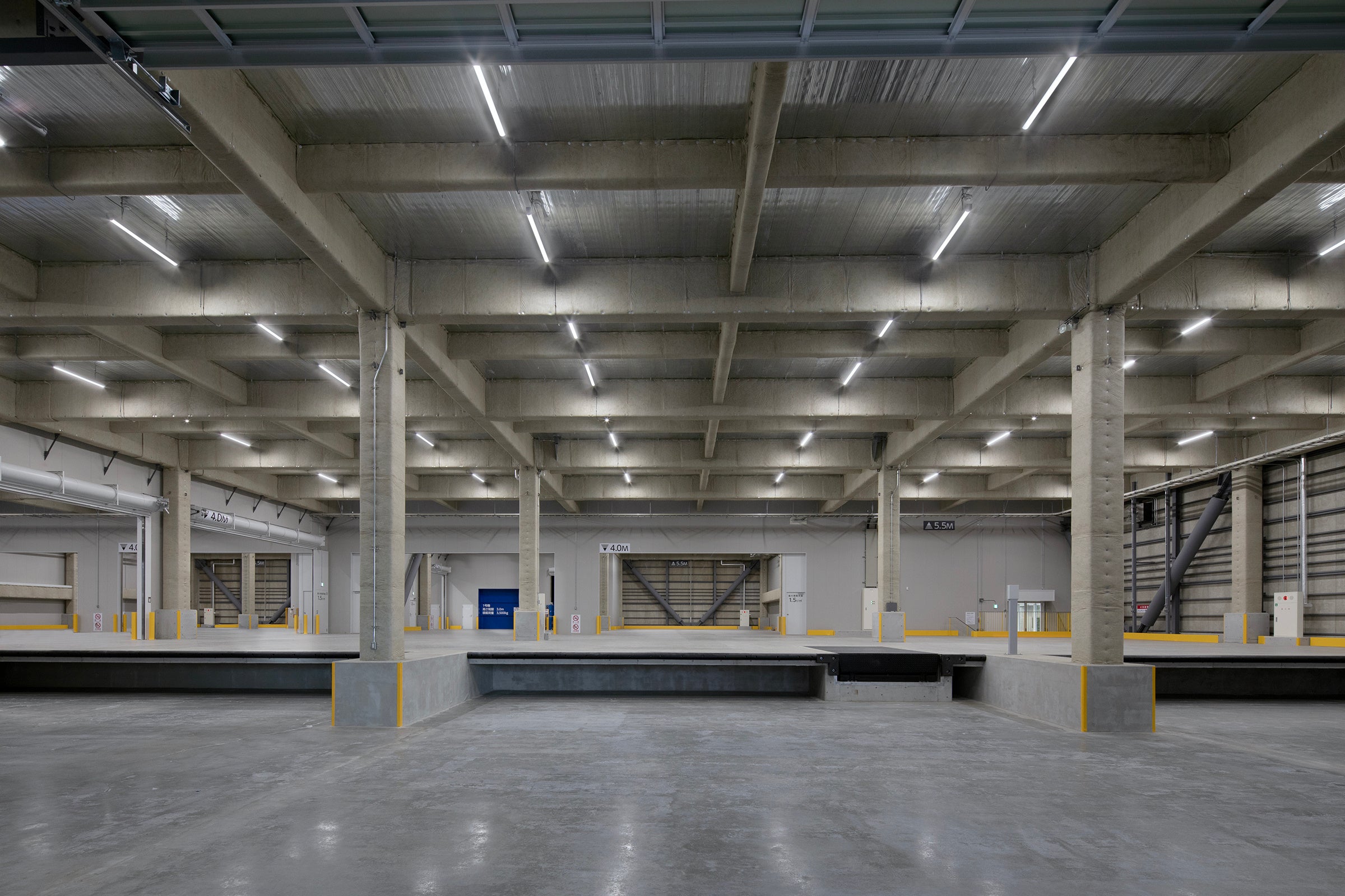 床荷重1.5t/平方メートル 、天井高5.5メートル(最上階は6.5メートル)、柱スパン10メートル以上、荷物用EV・垂直搬送機を各2基設置と標準仕様に加え、事務所を2カ所に配置し、分割対応も可能です。分割した場合、倉庫貸し床がそれぞれ約1,700坪に割れ、周辺の顧客ニーズに沿ったサイズ感での貸し出しが可能です。小売りや食品メーカーの物流需要や、周辺に集積している半導体関連企業のストックヤードとしての需要にも対応可能です。