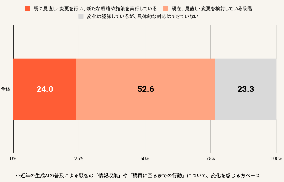 一方で、変化を感じている人に「顧客の変化に対応するため、戦略や施策の見直し・変更を行っていますか」と聞いたところ、「既に見直し、実行している」と回答した人は24%にとどまりました 。最も多い回答は「見直しや変更を検討している」(52.6%)で、「変化の認識」と「実際の行動」との間に明確なギャップが存在することが明らかになりました 。