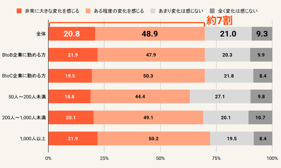 「生成AIの普及で顧客の購買行動に変化を感じるか」という質問に対し、約7割(69.8%)のマーケターが「変化を感じる」と回答しました 。