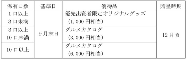 現行の優待制度を継続するとともに、優先出資を1年以上継続保有する優先出資者を対象に3月末の基準日時点における保有口数に応じた優待品(QUOカード)を追加いたします。
