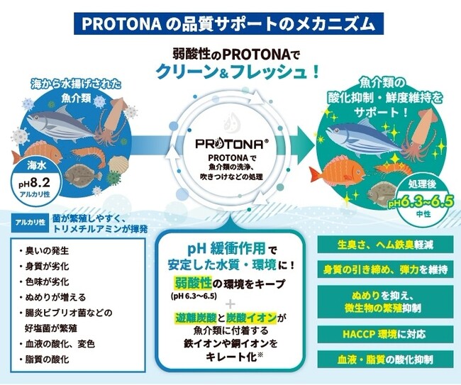 PROTONAは、魚の臭い・ぬめりの原因となる雑菌の繁殖を抑制する鮮魚処理専用水です。