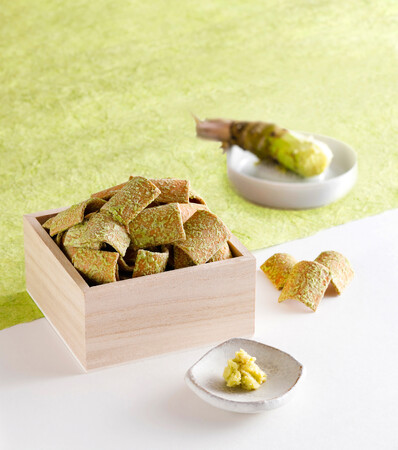 小袋シリーズとしては10年ぶりの新味として、「わさび」と「聖護院八ッ橋」を合わせた、わさび風味の八ッ橋を販売いたします。