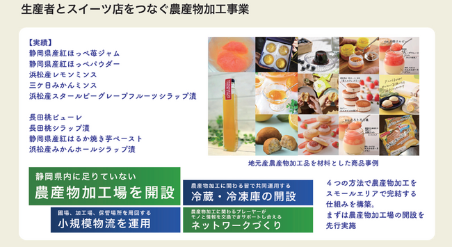 スイーツ店と農産物生産者双方の課題解決のために両者をつなぎ、地元産農産物を原料とした製菓材料の開発販売を9年前にスタート。主に未利用農産物や下位等級品の調達から手がけ、お菓子屋さんやパン屋さんがすぐ使える材料へと加工、産地の謳える材料として販売することで課題解決を図っています。またこの取り組みの中で見えた更なる課題は、近隣に農産物を加工する工場が少なく余分なコストとCO2が発生すること。そこで産地に近いエリアで加工が完結できる仕組み作りにも着手しています。[画像3: https://prcdn.freetls.fastly.net/release_image/168764/7/168764-7-6c8e93429b29c8998e5cb7baafe16e78-943x515.png?width=536&quality=85%2C75&format=jpeg&auto=webp&fit=bounds&bg-color=fff ]