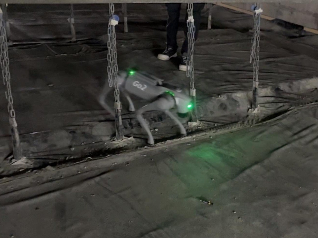 本試験は実際に稼働している工事現場の吊り足場上で実施しました。吊り足場全般の特徴として、一枚の大きな床材ではなく、細かい床材の集合であるため軽微な段差が多く存在すること、また床材と構造物を繋ぐチェーンやワイヤーなど、LiDAR(注2)で検知しにくい障害物があることが課題でした。本試験ではUnitree Robotics社の「Go2」という四足歩行ロボットにオリエンタル白石がプログラミングをしたシステムを用いて、以下の点を検証しました。