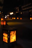 塩尻市内の学生や園児らによって創作されたオリジナリティ溢れる切り絵や書などの作品が、灯籠に飾られ、夜の奈良井宿を幻想的に照らします。