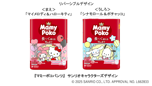 そこでこのたび、お子さまが喜ぶサンリオの人気キャラクターをデザインに採用し、親子で楽しくおむつ替えができる『マミーポコパンツ』サンリオキャラクターズデザイン企画品を、期間限定で発売します。