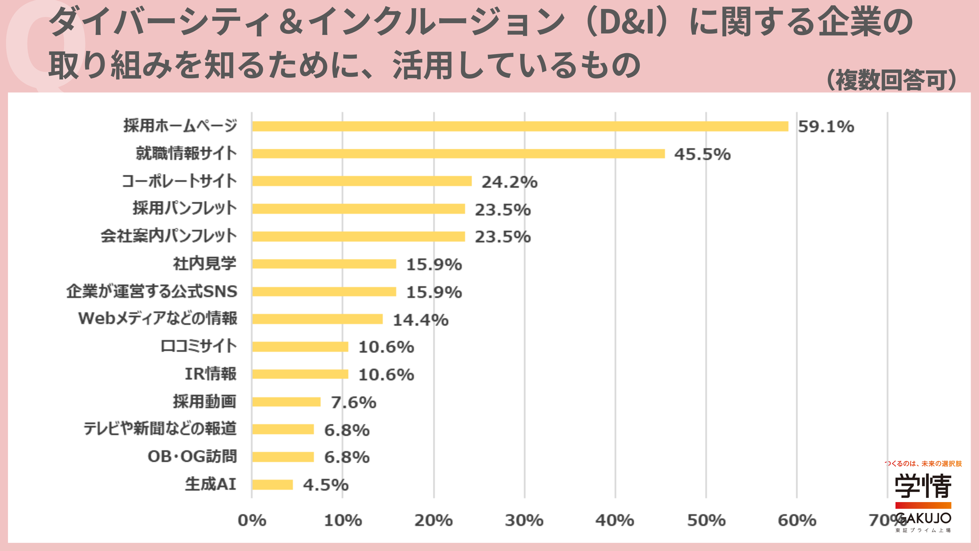 D&Iに関する企業の取り組みを知るために活用しているもの(複数回答可)は、「採用ホームページ」が59.1%で最多、次いで「就職情報サイト」45.5%でした。以下、「コーポレートサイト」「採用パンフレット」「会社案内パンフレット」が23~24%ほどで続きました。