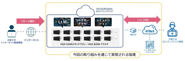 本実証実験では、ハイレゾが提供するGPUクラウドサービス「GPUSOROBAN-AIスパコンクラウド(以下AIスパコンクラウド)」と、アット東京が提供する全国規模のフレキシブルでセキュアな閉域網接続を実現する「ATBeX(アットベックス / AT TOKYO Business eXchange)」を組み合わせた環境を構築します。この環境を活用することで、LLMモデルへの独自データ追加学習や、機密性の高い開発中製品に関するシミュレーション等の業務を安全かつ容易に取り組むことが可能となります。