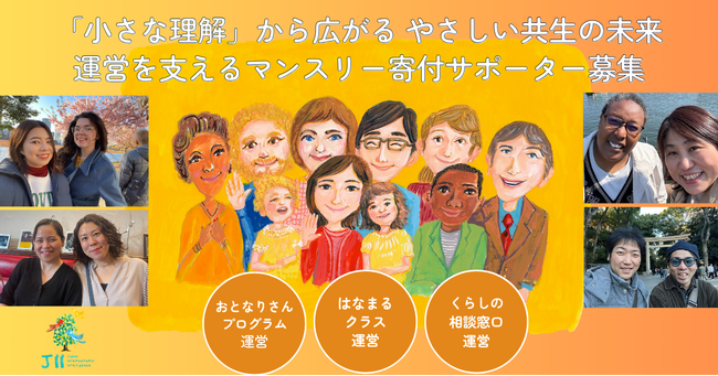特定非営利活動法人アジア人文文化交流促進協会(東京都目黒区、理事長:石川憲彦、以下「JII」)は、2025年11月5日(水)より、「小さな理解から広がる やさしい共生の未来」寄付プロジェクトを開始しました。本プロジェクトは 12月25日(木)まで実施され、外国人と日本人がペアで交流する「おとなりさん・ファミリーフレンド・プログラム」をはじめ、行政手続き、医療、教育、福祉、ライフラインにかかわる課題を単発でサポートする「スポットおとなりさん」、外国にルーツを持つ子どもたちへの日本語学習支援「はなまるクラス」や、生活課題に専門家と連携して取り組む「くらしの相談」など、JIIが展開する多文化共生の活動の運営を強化するために活用します。