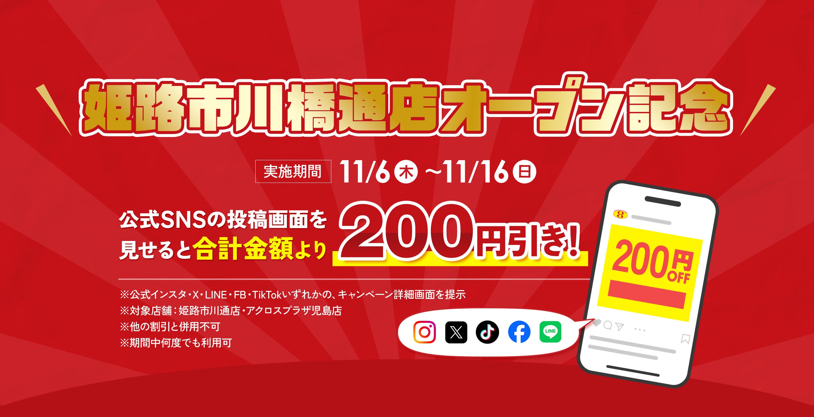 地域の皆様と新たな絆を育む第一歩として、11月6日(木)から11月16日(日)までの11日間限定でグランドオープン記念キャンペーンを実施。公式SNS(Instagram・X・TikTok・Facebook・LINE)のキャンペーン投稿画面をご提示いただくことで、お会計時に合計金額から200円を割引いたします。