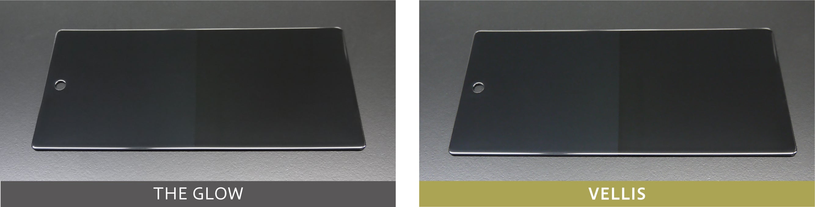 コンパウンドで研磨したJIS規格の黒色塗装板の右半分にコーティング処理。「THE GLOW」の色差変化値は1.2となり、高い艶出し性能を発揮しているが、「VELLIS」の色差変化値は1.5と「THE GLOW」と目視で違いがわかるレベルで高い艶出し性能を実現している