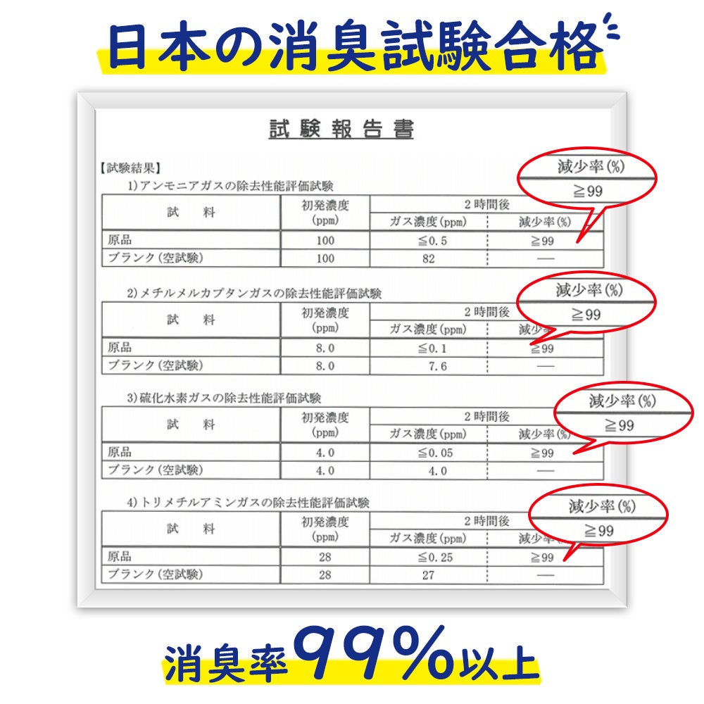 国内の検査機関において消臭率99%以上であることが実証済みです。