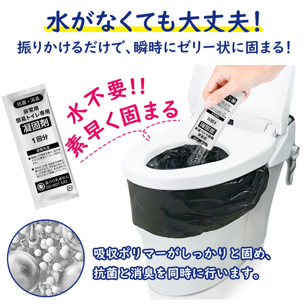 組み立ての必要がなく、すぐに使える簡易トイレです。15年の長期保管が可能!日本国内での消臭・抗菌試験にも合格した凝固剤を採用しているため、清潔にお使いいただけます。フック陳列にも対応したパッケージで店頭販売用としても活用できるタイプです。
