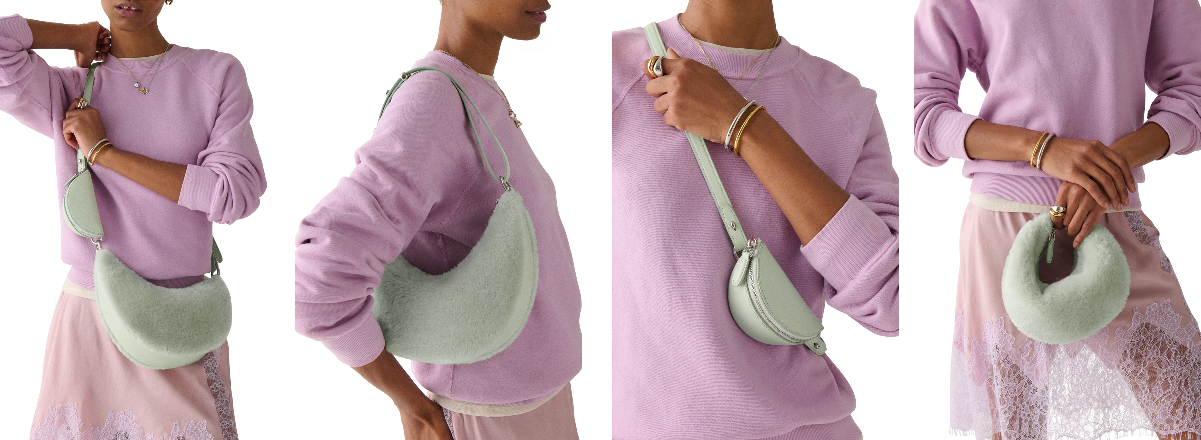 左から:ケーエスデュオ クロスボディ バッグ ブラック、カシューミルク ¥52,800、 ケーエスデュオ スエード クロスボディ バッグ バーントセージ ¥52,800、 ケーエスデュオ ダウンタウン レオパード ヘアカーフ クロスボディ バッグ レオパードマルチ ¥62,700、 ケーエスデュオ シアリング クロスボディ バッグ ミントフロスティング ¥62,700、 ケーエスデュオ シアリング ベア クロスボディ バッグ ブラックマルチ ¥71,500、 ケーエスデュオ グレーズドレザー クロスボディ バッグ マーケットパープル ¥52,800 すべて税込み価格。 サイズ:22cm × 27cm × 7cm