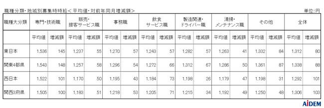 職種大分類別の平均時給は、「専門・技術職」1,522円(前年同月比101円増)、「製造関連・ドライバー職」1,198円(同26円増)、「事務職」1,195円(同43円増)、「飲食サービス職」1,184円(同73円増)、「清掃・メンテナンス職」1,179円(同47円増)、「販売・接客サービス職」1,170円(同50円増)の順で、前年同月比で全ての職種がプラスとなった。関西3府県全体の平均時給は、前年同月比103円増の1,306円