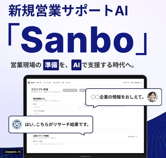Sanboは、営業現場の準備工数を削減し、均質で高品質な営業活動を実現する“営業の参謀AI”として、SaaS企業を中心に提供を開始します。