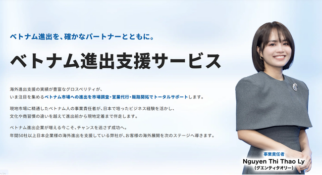 本サービスは、ベトナムでの市場調査から販路開拓(営業代行やEC運用代行)、現地法人設立・輸出入支援まで、ワンストップでのサポートが可能となっております。ベトナム出身で現地市場にコネクションを有し、かつ日本企業での経験も豊富なNguyen Thi Thao Ly(グエンティタオリー)が事業責任者を務めることで、現地市場に高い精度でローカライズ・アクセスしながら日本企業の海外進出をご支援いたします。