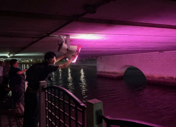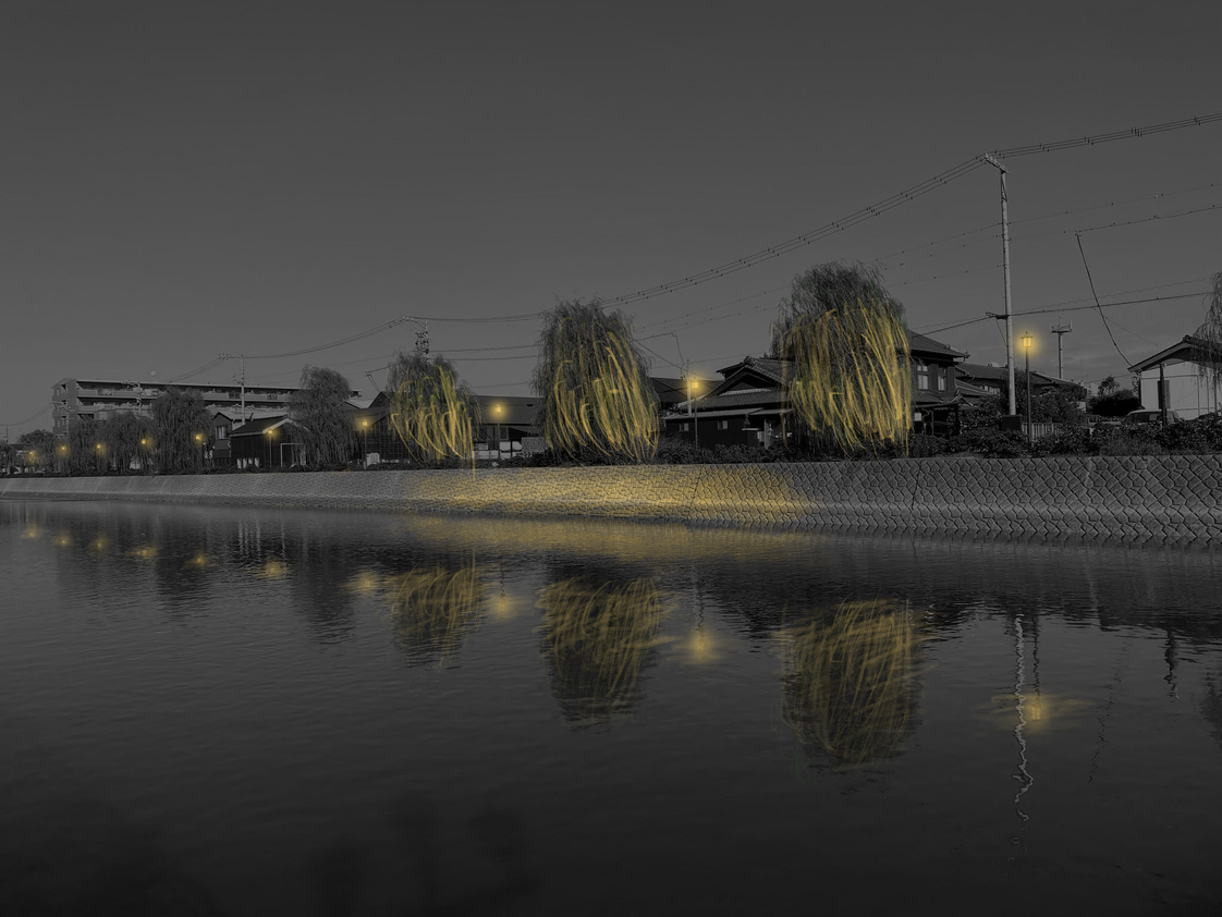 風情を感じる景色を演出するため、運河沿いの樹木や護岸を照らす実験を行います!