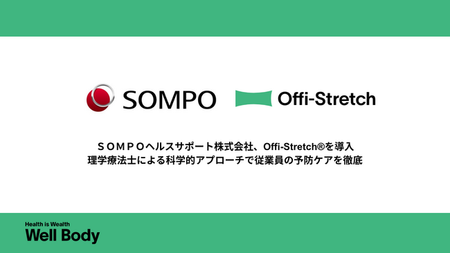 Well Body株式会社(本社:東京都渋谷区、代表取締役社長:水野 純一)は、SOMPOヘルスサポート株式会社(本社:東京都千代田区、代表取締役社長:加納 昌明)の従業員約200名を対象に、企業向けフィジカルケアサービス「Offi-Stretch(R)︎」(姿勢診断・慢性痛予防改善のフィジカルケア)を提供いたしました。