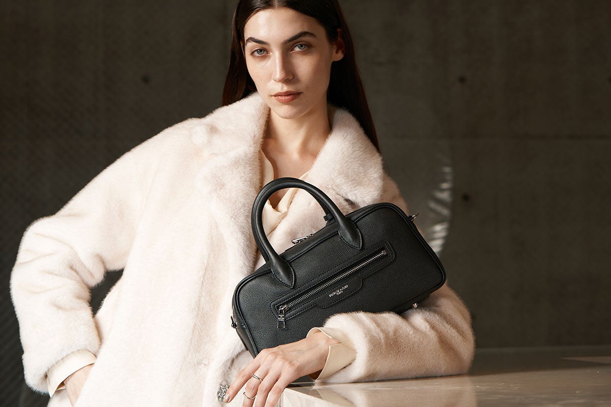 わずか約500gの軽やかさと、しなやかなレザーの艶が魅力の2WAYミニボストン。バッグと同じオールレザー製のロングショルダー付きで斜めがけが可能。