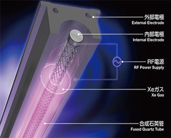 ・高いエネルギー(172nm)、単一波長、低温照射、瞬間点灯消灯が可能