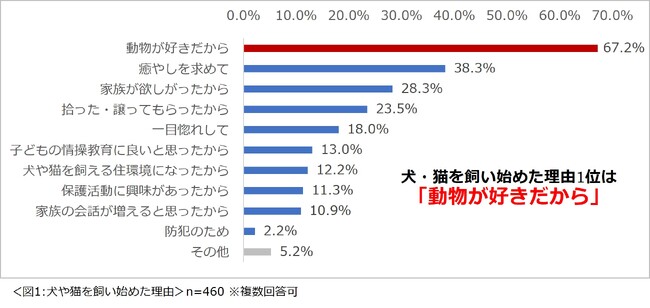 現在の住まいで、犬や猫を飼っている460名に、犬や猫を飼い始めた理由について尋ねたところ、「動物が好きだから」という回答が最も多く67.2%という結果になりました。(図1)