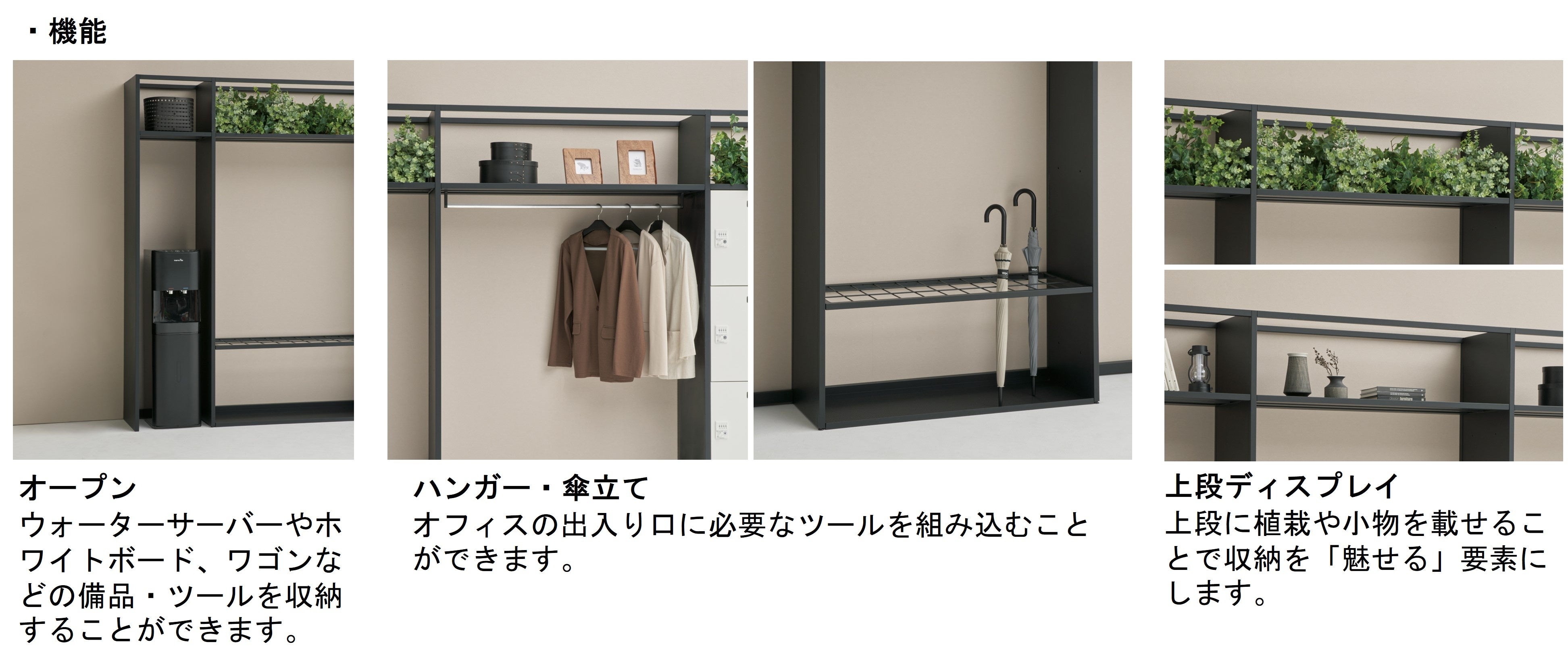 「Casing」は、壁面に設置した収納や、ハンガー・傘立てなどをひとつなぎのフレームで囲うことで空間に調和させるフレームシステムです。高さが異なる収納を囲う収納ユニットと、ハンガーや傘立ての機能を持つアクセサリーユニットをラインアップしています。収納と機能がひとつなぎになるようにフレームで囲うことで、美しさと使いやすさを両立し、造作による内装のような一体感を生み出します。サイズはオカムラの収納およびモバイルロッカーのモジュールに合わせた展開で、カラーはブラックです。一体感を生み出すデザインが、さまざまなオフィス空間に自然に調和します。