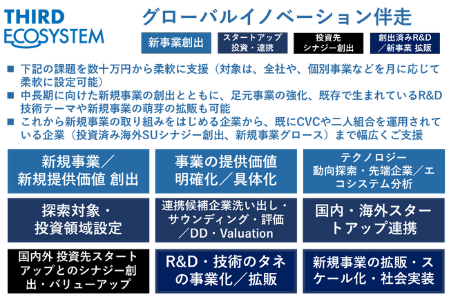 国内外スタートアップ連携や新規事業創出・イノベーションを支援する「グローバルイノベーション伴走」サービスを展開しています。本サービスでは国内・海外でのスタートアップ連携、既存で生まれている新規事業の萌芽やR&D技術テーマの拡販・スケール・社会実装などの新価値・新規事業の創出・強化を月数十万円からスモールスタートを伴走します。(これから新規事業の取り組みをはじめる企業から、既にCVCや二人組合を運用されている企業まで幅広くご支援しています)