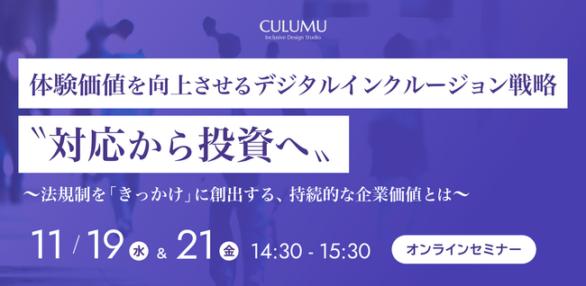 11月19日(水)と11月21日(金)14時30分から「体験価値を向上させるデジタルインクルージョン戦略“対応から投資へ”~法規制を「きっかけ」に創出する、持続的な企業価値とは~」 セミナーを開催します。
