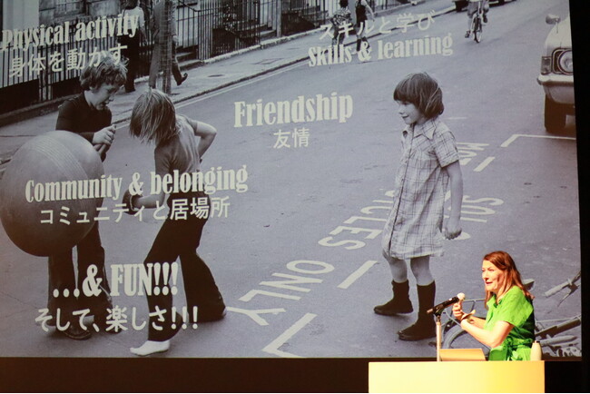 基調講演では、アリス氏がプレイストリートを始めることになったきっかけや、それが英国中に広がるまでのプロセス、そしてプレイストリートの実施によって「住みやすい住宅環境」「市民意識の醸成」「コミュニティづくり」「子どもの健康」など、まちに様々な効果をもたらすことを話していただきました。
